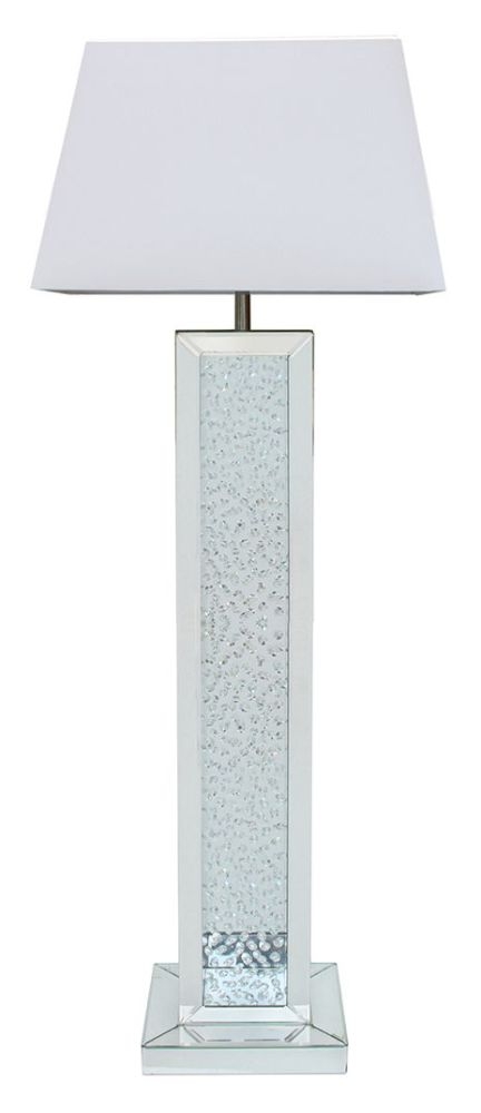 Mirrored Astoriaia floor lamp with floating crystal base design. Lamp comes with a 22 inch rectangular white shade. This product comes with a UK EU Dual Plug. Base : MirroredShade : Fabric