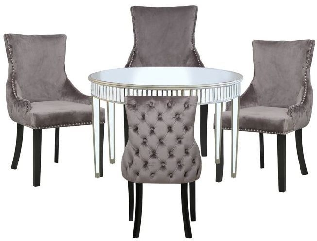 With its timeless appeal the venetian style 120cm Antrim Silver mirrored dining table will bring a touch of luxury to any dining room. Featuring an antique champagne trimmed edges, sturdy pillar legs and champagne mirrored panels throughout including the large table top. Accompanying the table are 4 deep padded grey coloured faux velvet chairs featuring a button tufted back, silver studded edges and strong black wooden legs. Can seat up to 4 people.