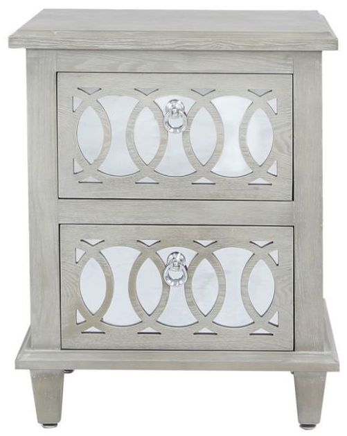 Bringing a wonderful modern twist on a classic natural wooden furniture range. The Bayview bedside cabinet is crafted from high quality natural wood with 2 drawers that feature an intricate overlapping circular design with clear mirror insets and metallic ring handles on storage drawers. GENERAL CARE INSTRUCTION This product care will guide you on the best way to care for your product to maximize their guaranteed life. Protect from direct sunlight. The location of your product can affect its durability, thus placing it too close to high-temperature appliances can increase the risk of scorching damage or discoloration and placing the item where it can touch external walls can create moisture build-up. Sharp objects and even the claws of your pets can tear, scratch or break the product. * Periodically wipe clean with a soft dry cloth and/or non-abrasive cleaner. * Do not rub or scrub the surface when cleaning. * Take precautions in using vacuums and use low suction as much as possible to maintain product integrity. * Do not strike the material with hard or pointed items. * Do not use abrasive and harsh cleaning products. * Do not sit or stand on products otherwise indicated. * If liquid spills do occur, wipe or blot with dry clean cloth as soon as possible. * Avoid direct and continuous exposure to sunlight. * Care must be taken in using coloured cleaning materials as it may transfer or stain products. * Always follow cleaning product guide/manual on any cleaning product used. * Dragging, pulling, and dropping any product is not recommended. * Do not place items with extreme temperature on the product as it may cause brittleness. DISCLAIMER MIRRORED product has intentional gaps between the cut corners, this is to accommodate the natural expansion and contraction of the wooden body that occurs during fluctuating temperatures. Avoid exposing your furniture to excessive heat e.g. by placing it in front of a radiator, as this can cause cracking. Glass or mirrored panels should be cleaned using a non-solvent based glass cleaner and soft cloth, carefully avoiding contact with wooden or painted sections.